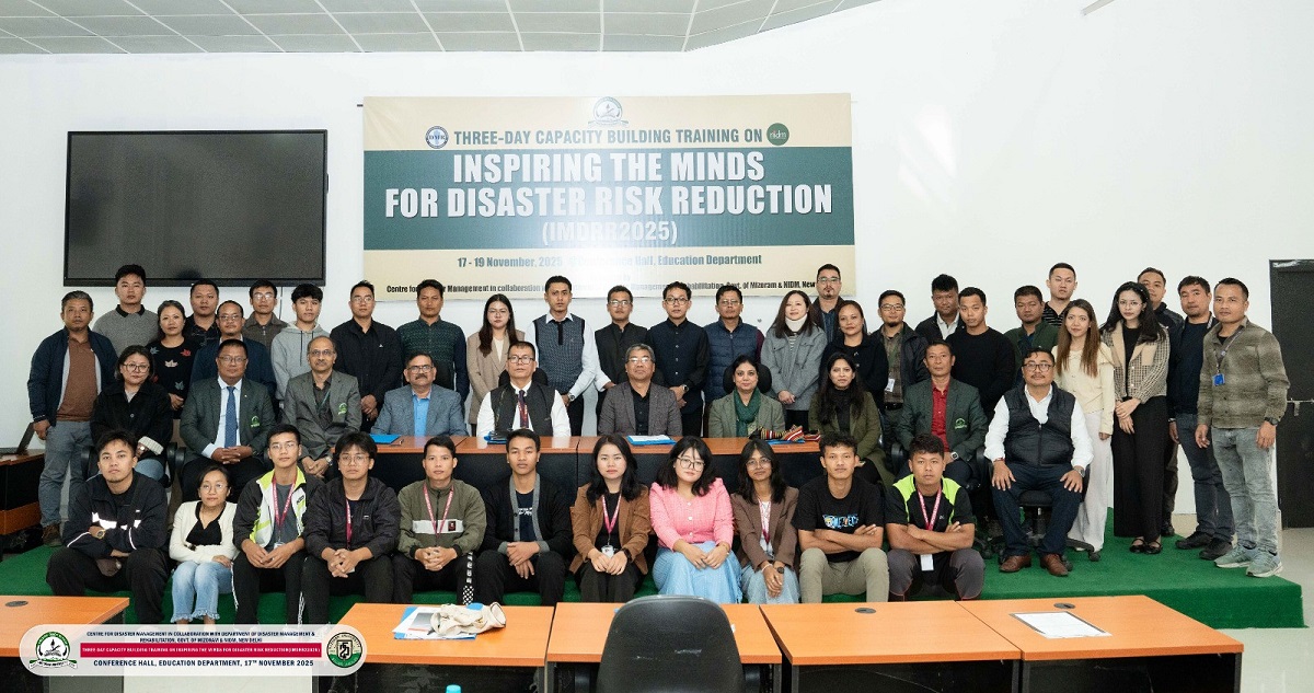 Ni thum awm tur “Three- Day Capacity Building Training on Inspiring the Minds for Disaster Risk Reduction (IMDRR2025)” chu vawiin atang khan, MZU Centre for Disaster Management buatsaihin Conference Hall, MZU Education Department-ah neih tan a ni a. A hawnna inkhawm hi Aizawl District Disaster Management Authority (ADDMA) Chairman, Er. Lalhriatpuia chuan khuallian niin a hmanpui a, Prof. Lalnundanga, MZU Registrar chu khual zahawm a ni.